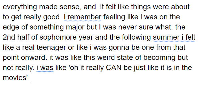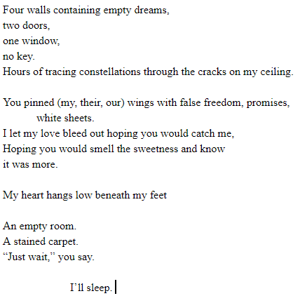 I watched myself spread out on my maybe-white-one-day carpet, records spinning what I had then assumed was a ballad of love, what I now know to be a confession of loneliness. Fingers tracing out circles on my stomach; I wish I knew what I was thinking. I wish I could go back and rewrite the words that had become a mantra. As if all it took was reorganization to turn longing into solace.