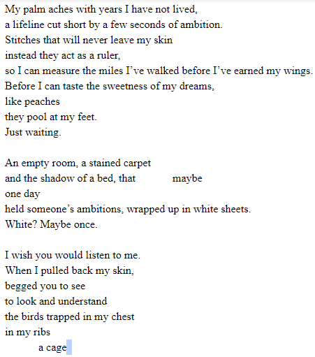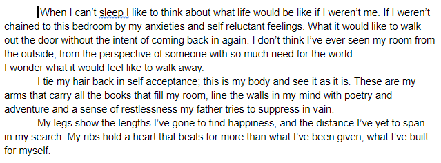 I watched my rocking chair move like the arm of a clock, following the sunlight from my window until there was none left to read. I saw my hand fill with ink splotches, notes of thoughts I was too lazy to write on paper but found important enough to remember in the dark.